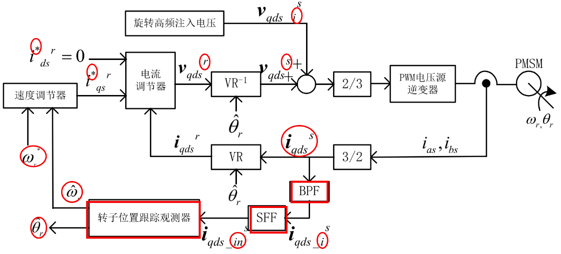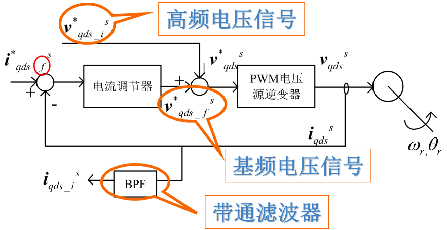 - 经过带通滤波器BPF得到高频旋转电流信号\(i_{qds\_i}^i\)