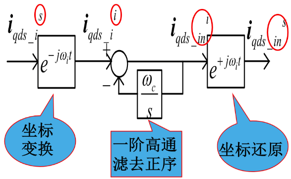 - 经过同步轴系高通滤波器SPF得到电流的负序分量\(i_{qds\_in}^i\)