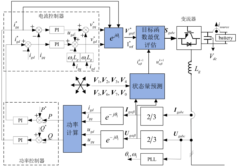 - 并网逆变器的主要的功能是保持直流母线电压\(V_{dc}\)的稳定、输入电流正弦和控制输入功率因数。