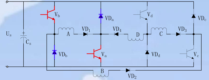 Va和Vb导通时,A相绕组通电;Va和Vb关断时,绕组通过\(V_{Da}\)、\(V_{Db}\)和\(V_{D1}\)续流