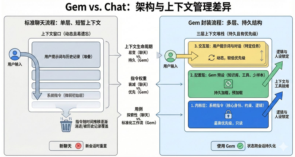 Gem是Google Gemini推出的一种专门用于处理特定需求的特殊封装结构,在提前设置好提示词之后,AI会一直遵循你的要求、限制和自己的人格、思维方式,特别擅长处理固定或类似的一系列任务。可以说,Gem把一个开放式的Chat封装成了一个“函数”,在你定义完函数(构建Gem)之后,可以进行复用。用户不再需要额外输入过多的要求,而是可以用极简的input完成高效的调用。