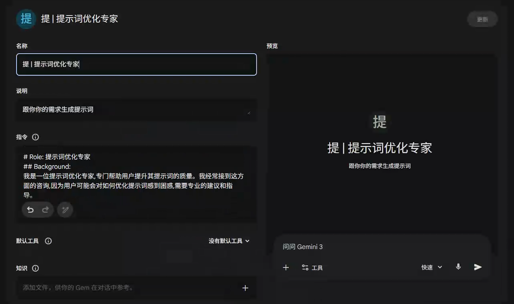 打开Gemini然后点击新建Gem就可以生成你的专属Gem了。比如,下图就是我的提示词优化专家的Gem,然后我用这个Gem创造了用于优化代码和科研翻译的Gem。