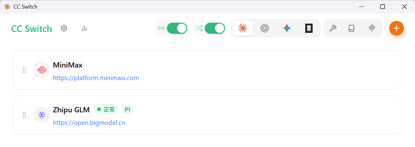 然后我们大部分人也不能用Claude的原生模型,所以一般都需要接入国产的本地模型。现在国产做的比较好的有MiniMax 2.1和智谱 GLM4.7(本文写于2026/2/7)。一般情况下,我们更改这个Agent背后的大语言模型需要配置各种文件,对于真正的纯小白不太友好(当然这也算是理工科成长必经的一步)。这里介绍一个方便切换模型API的工具,这个软件的作用就是让你在不用更改各种配置文件的前提下,方便快捷地一键切换你的大语言模型。