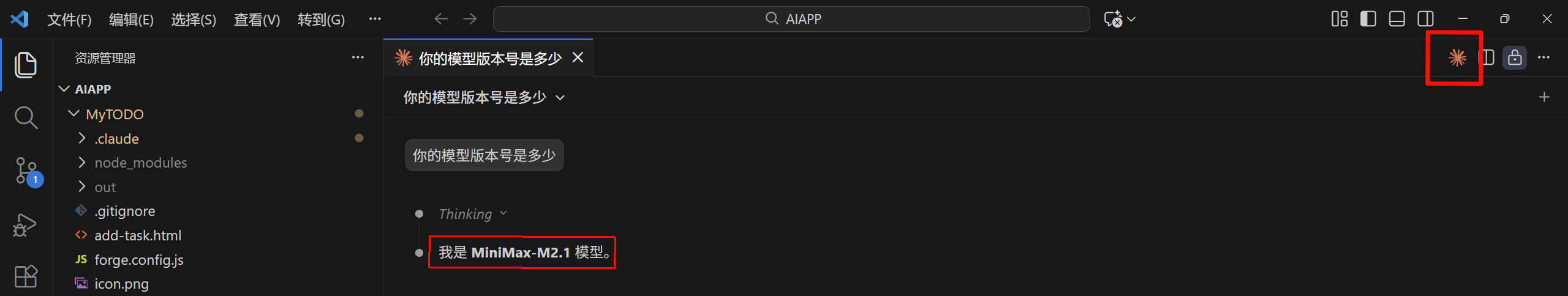 好了如果到这一步都没有出问题的话,那么恭喜你已经完成90%的配置了。现在你应该能看到一个跟平常使用AI对话非常相似的界面。然后现在让我们测试一下我们的CCS是否配置成功,询问它“你的模型版本是什么?”,发现它返回MiniMax 2.1,跟我们在CCS中配置的一样,说明成功了。