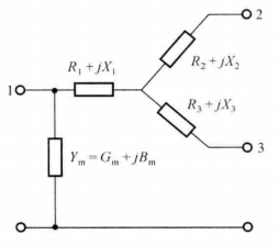 - 有些厂家只提供了Pkmax,那么就把这个当成容量最大的两个支路一起提供的损耗。然后电阻按照容量大小反向分配,即100/100/50就是两个100的电阻等大平分,50那组的电阻值大小就是100的两倍。比如:\(R_1=R_2=\frac12\frac{P_{kmax}}{1000}\frac{U_{1N}^2}{S_N^2}\,;\,R_3=2R_1\)