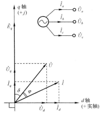 | 定子空载相电势 | 每相绕组电阻 | 定子纵轴、横轴同步电抗 | 功率角(\(U\)和\(E_q\)的夹角) |
