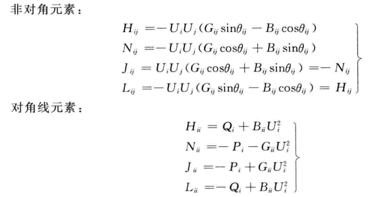 \[ \begin{gather*} \Rightarrow \begin{cases} P_i=U_i\sum_jU_j(G_{ij}cos_{ij}+B_{ij}sin_{ij})\\Q_i=U_i\sum_jU_j(G_{ij}sin_{ij}-B_{ij}cos_{ij})\\ \end{cases} \\\Rightarrow \begin{cases} \Delta P_i=\sum_j(\frac{\partial\Delta P}{\partial \theta_j}\Delta\theta_j+\frac{\partial\Delta P}{\partial U_j}\Delta U_j)=\sum_j(H_{ij}\Delta\theta_j+N_{ij} \Delta U_j/U_j) \\\Delta Q_i=\sum_j(\frac{\partial\Delta Q}{\partial \theta_j}\Delta\theta_j+\frac{\partial\Delta Q}{\partial U_j}\Delta U_j)=\sum_j(J_{ij}\Delta\theta_j+L_{ij} \Delta U_j /U_j)\\ \end{cases}\\ \begin{bmatrix}\Delta P\\\Delta Q \end{bmatrix}=\begin{bmatrix}H&N\\J&L \end{bmatrix}=\begin{bmatrix}\Delta\theta\\U^{-1}\Delta U \end{bmatrix} \end{gather*} \]