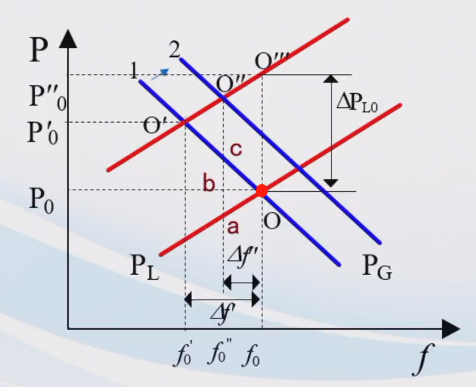 二次调频:\(\Delta P_D-\Delta P_G=K_S\Delta f''\),即\(f_0''=f_0-\frac{\Delta P_D-\Delta P_G}{K_S}\)