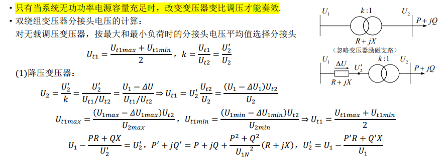 最小负荷下选分接头 \(U_{1t}=\frac{U_{1min}-\Delta U}{U_{2Rmin}}U_{2t}\) |