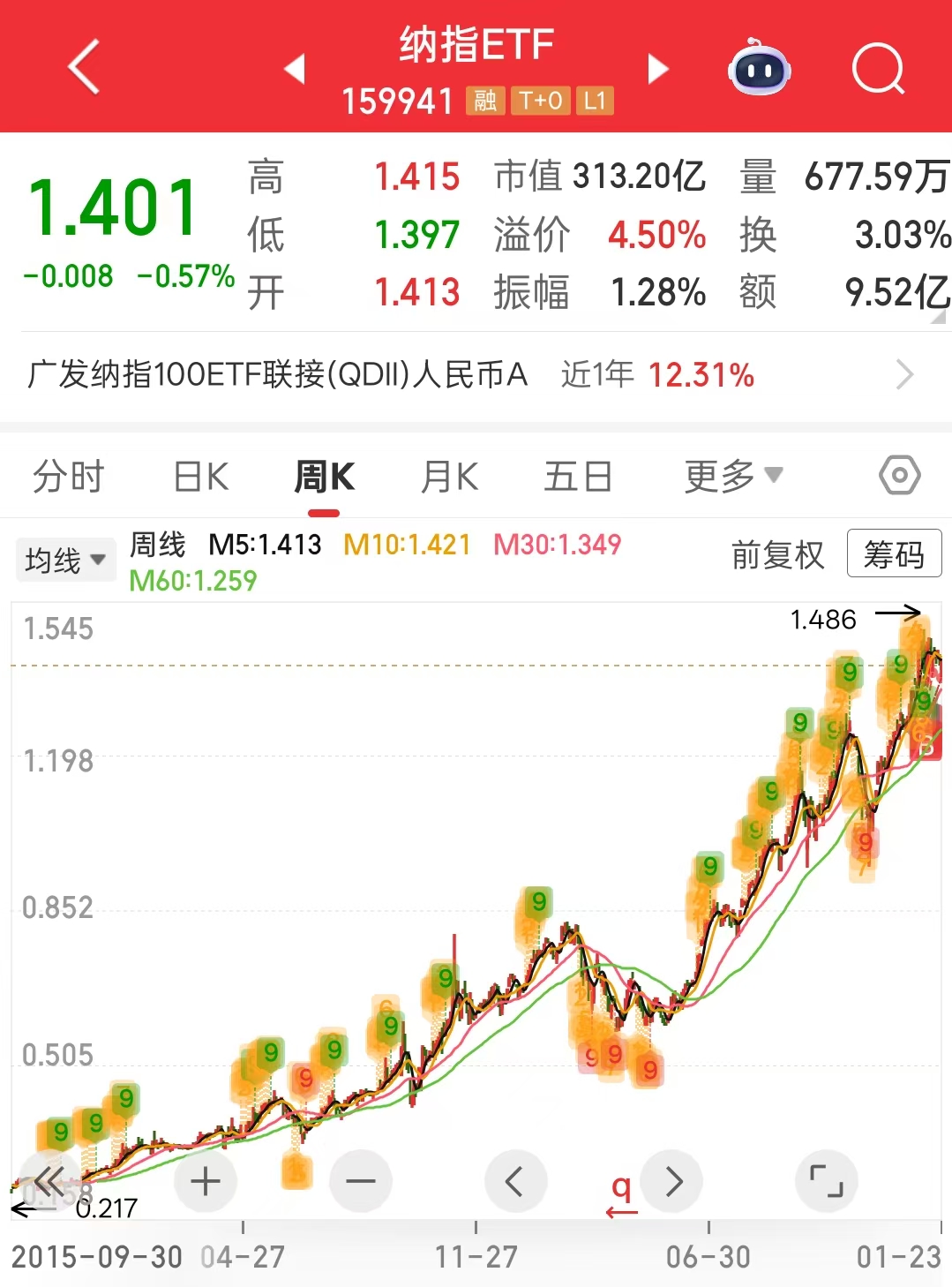 当然也不是说有了溢价就绝对不能投资,因为除了热门程度之外,尤其是海外的ETF,溢价率还会受到汇率波动等事件的影响。比如场内热门的纳斯达克指数,常年都有4~6%的溢价率,当纳斯达克的溢价率低于4%的时候一般我们就认为这是一个低值了,如果此时股价也合适,那么就可以入手一部分。