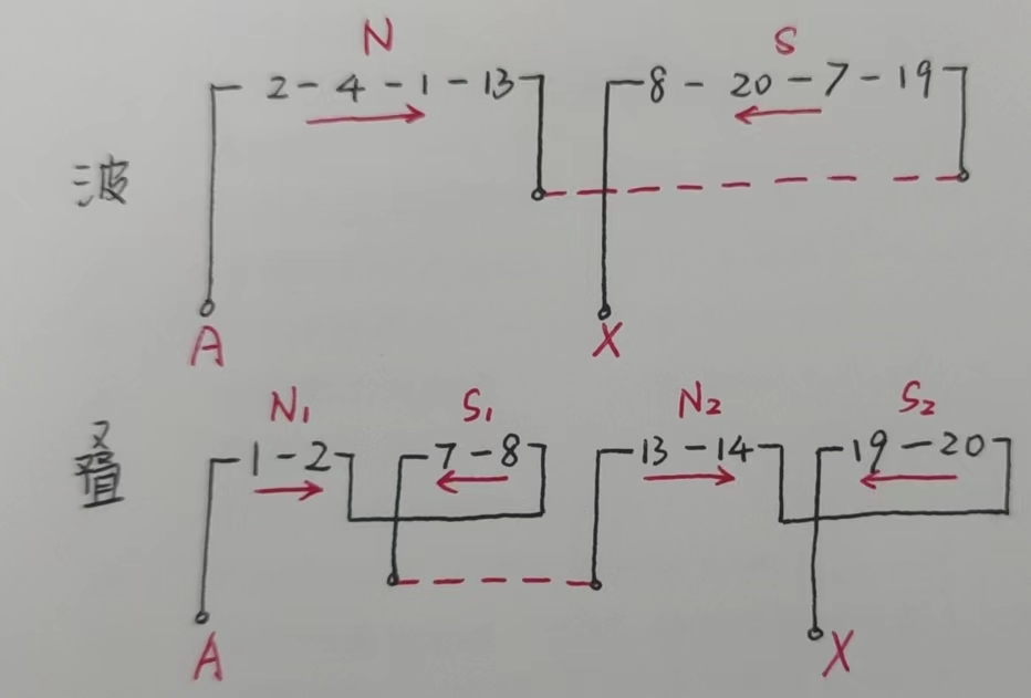 | 第一节距$y_1$:同一线圈上下元件边跨过槽数 | $y_1=\lfloor\tau\rfloor$ | $y_1=\lfloor\tau\rfloor$ |