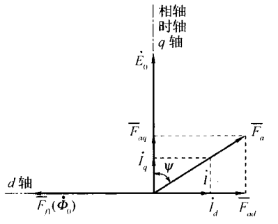 电枢反应仍然可以被分解为交轴和直轴。交轴分量产生电磁转矩,直轴分量引起去磁或增磁(一般而言是前者)。下方图片中几个物理量的关系是:$F_{f1}$与$\phi_0$基本近似为同向,$E_0$落后90°,定子电流$I$落后$E_0$内功率因数角$\psi$,定子磁场$F_a$与$I$同向。