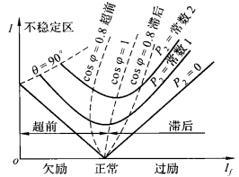 - 欠励的励磁电流不能过小,否则功角将超过90°进入不稳定区,电枢电流的增磁效应不足以补偿主磁通,产生不了足够的电磁转矩拖住转子,电机失步。